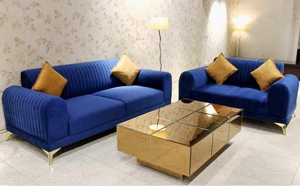 We are Using Heavy Material For All Product also high Fabric Quality In 3 Seater Sofa Set Styles Blue Full Cover Set Designer full Wooden Frame with Sal Wooden Leg.